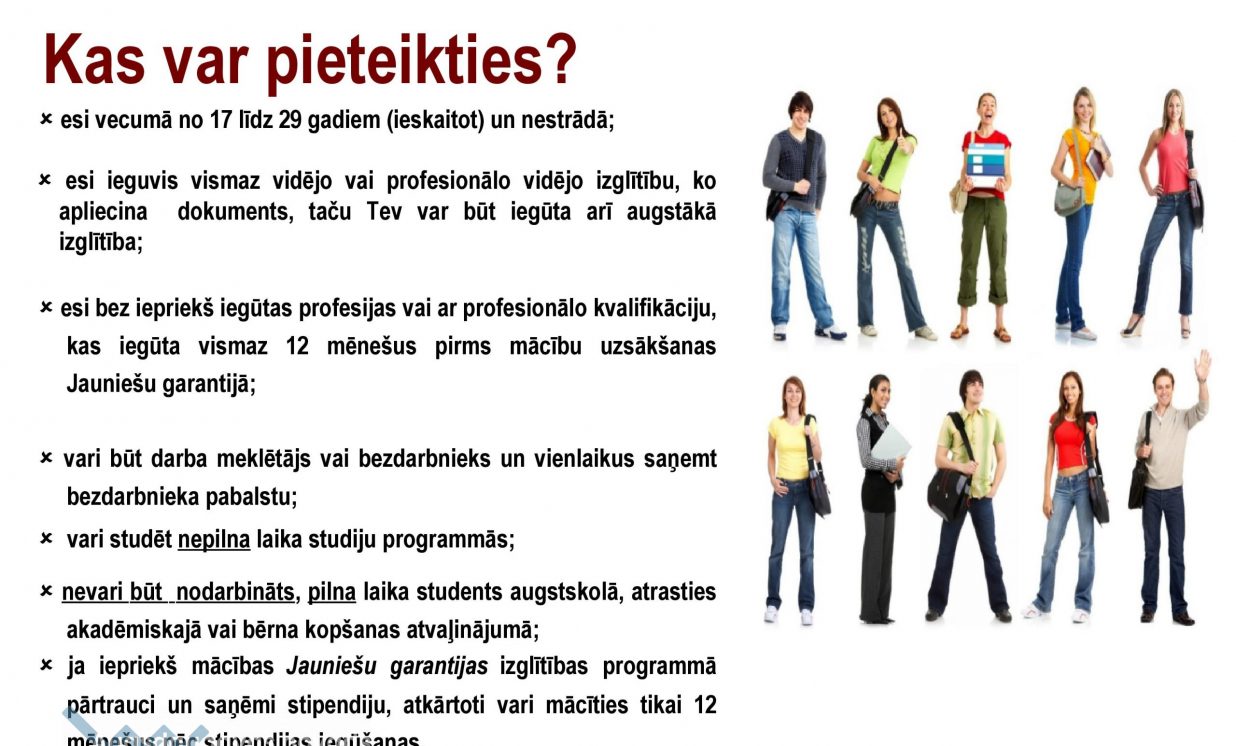 - esi bez iepriekš iegūtas profesijas vai ar profesionālo kvalifikāciju, kas iegūta vismaz 12 mēnešus pirms mācību uzsākšanas Jauniešu garantijā;