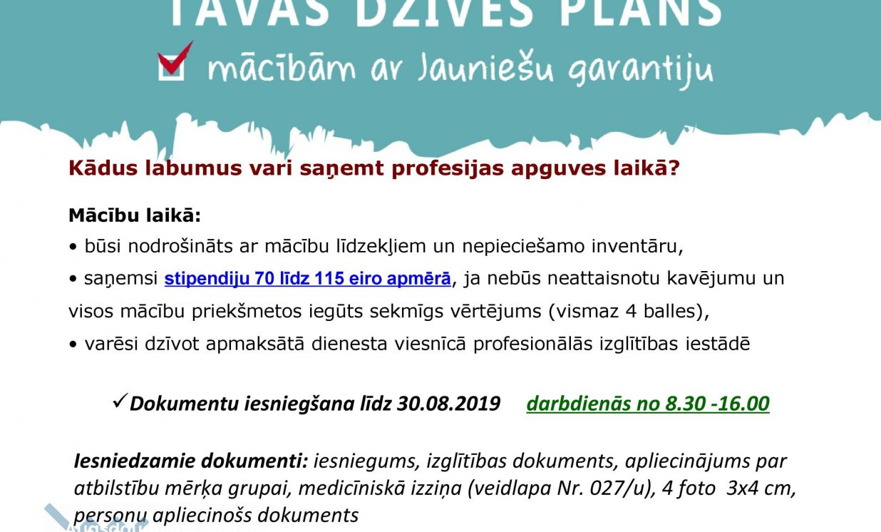 Saņemsi stipendiju 70 līdz 115 eiro apmērā, ja nebūs neattaisnotu kavējumu un visos mācību priekšmetos iegūts sekmīgs vērtējums, varēsi dzīvot apmaksātā dienesta viesnīcā profesionālās izglītības iestādē.