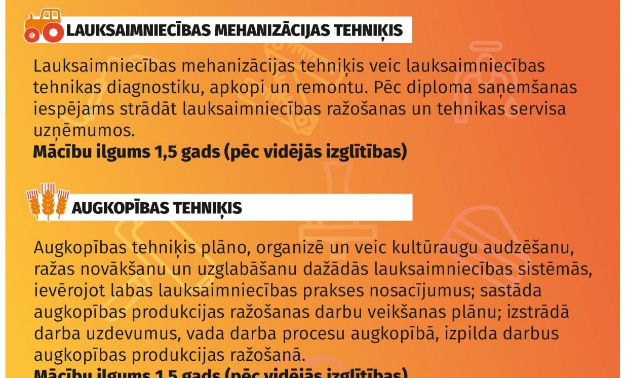 ”Lauksaimniecība vienmēr ir bijusi nozīmīga nozare Latvijā. Gan reģiona attīstībā, gan arī darba tirgū. Nozare ļoti strauji attīstās, pieaug darba ražīgums tajā, līdz ar to pieaug prasības arī jaunajiem speciālistiem un jaunām darba rokām, kas būtu prasmīgas un zinošas savā nozarē,” skaidro struktūrvienības vadītāja izglītības jomā Anita Lāčauniece.