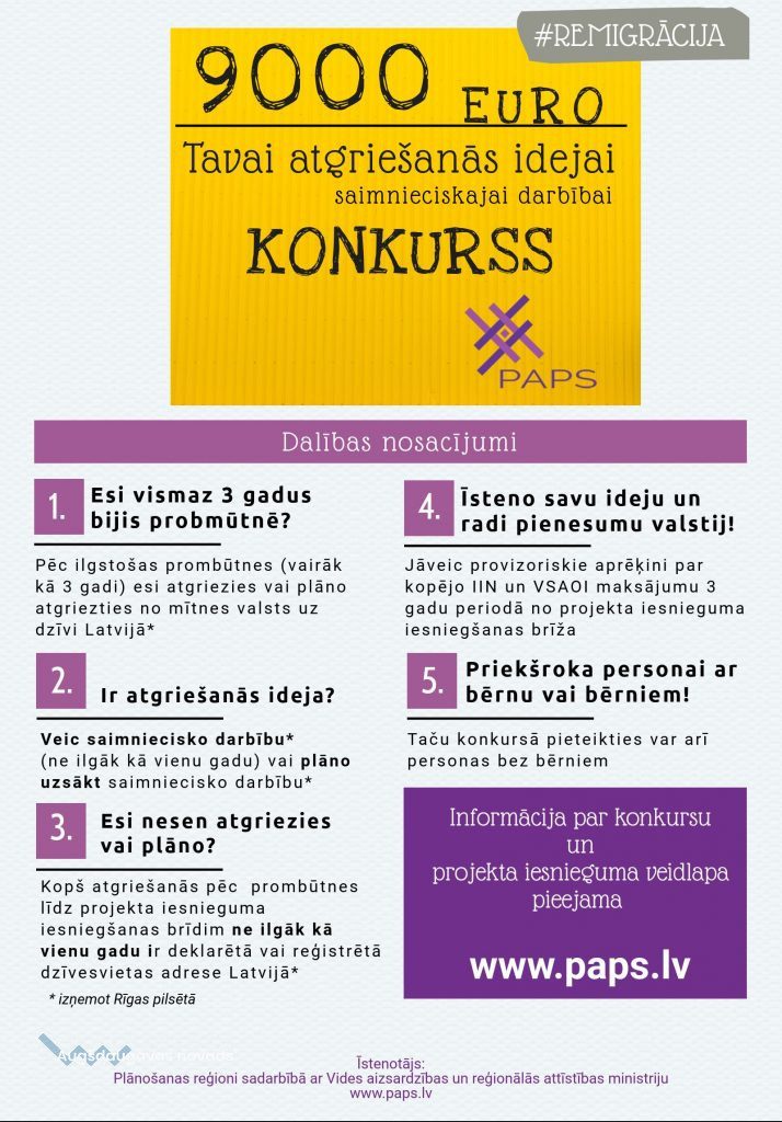 Latgales plānošanas reģions izsludina uzņēmējdarbības projektu konkursu remigrantiem saimnieciskās darbības uzsākšanai, īstenošanai un attīstībai Latgalē. Pieteikties grantam var persona, kas bija izdeklarējusies no valsts vismaz trīs gadus un ir atgriezusies Latvijā ne vairāk kā pirms gada. Par dzīves vietas maiņu ir uzskatāms deklarēšanās brīdis. Kopējais atbalsta pasākuma finansējums Latgales plānošanas reģionā sastāda 36 000 EUR. Viena projekta maksimālais līdzfinansējums ir 9 000 EUR. Projektu iesniegumu iesniegšanas termiņš ir no 2018. gada 24.augusta līdz 2018. gada 25. septembra plkst. 17:00 (ieskaitot). Vairāk informācijas šeit.