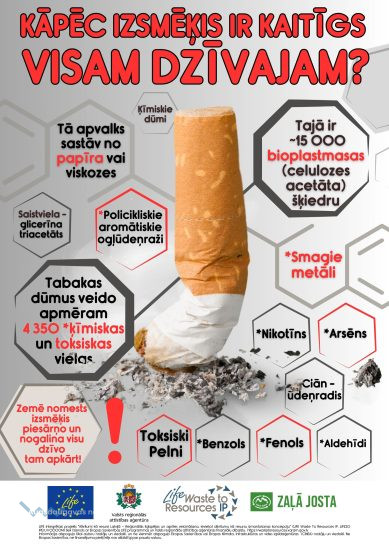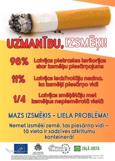 Šī gada piekrastes monitoringa dati liecina, ka izsmēķi ir izplatītākā piesārņojošā atkritumu vienība Latvijā. Lai veicinātu sabiedrības izpratni un iedzīvotāju uzvedības maiņu attiecībā uz izsmēķu pareizu izmešanu, projekta partneris SIA “Zaļā josta” ir izstrādājis informatīvus un izglītojošus plakātus un īsfilmu “Izsmēķa ceļš”.