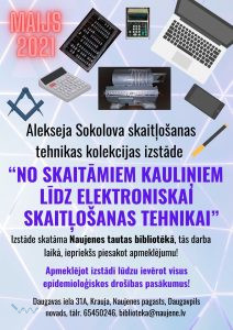 Maija mēnesī Naujenes tautas bibliotēkas izstāžu cikla "Bibliotēkas vitrīnas stāsti" ietvaros skatāma Alekseja Sokolova skaitļošanas tehnikas kolekcijas izstāde "No skaitāmiem kauliņiem līdz elektroniskai skaitļošanas tehnikai".