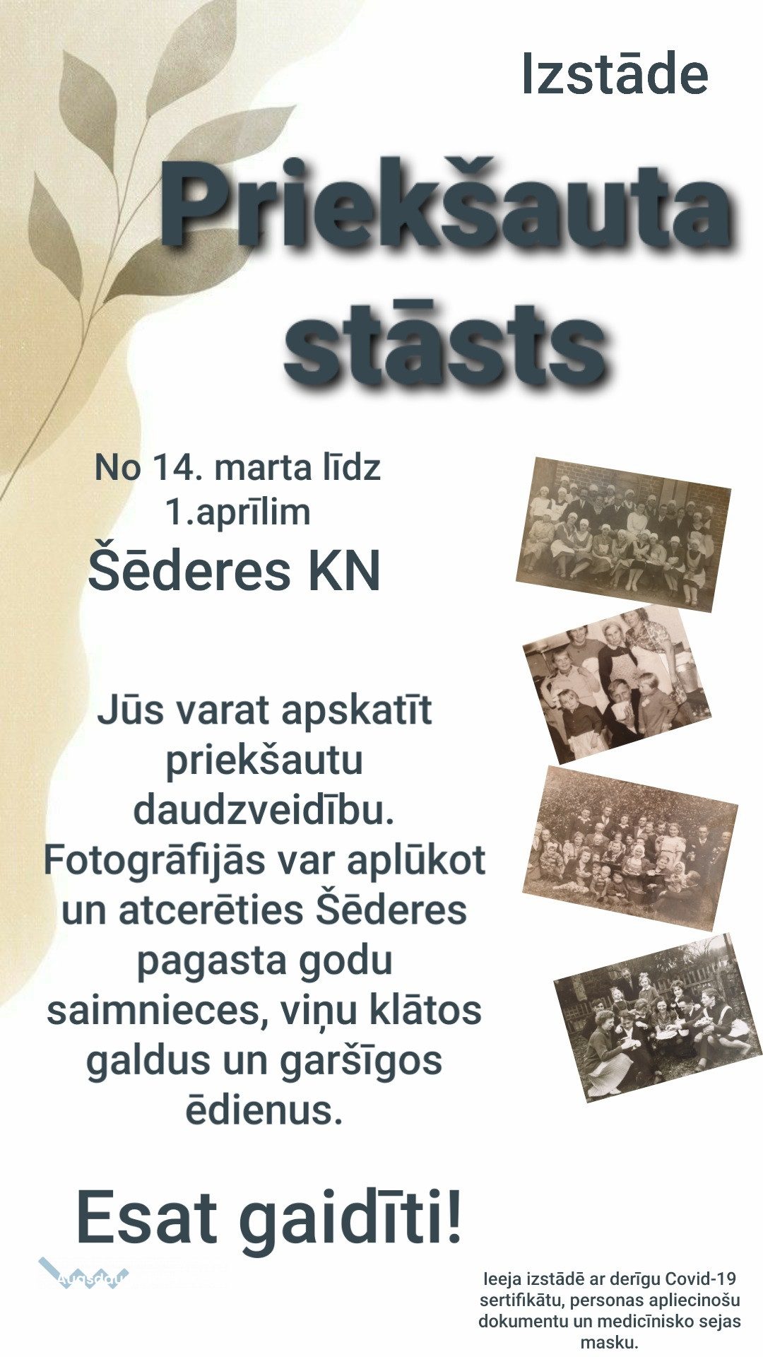 Agrāk katrā virtuvē bija atrodams saimnieces priekšauts. Tagad tas ir retums. Katram priekšautam ir savs stāsts, pilns pārdzīvojumu un piedzīvojumu. Viens priekšauts ir raibu raibais, cits izbalējis saulītē, kādam tauku pleķītis virsū, citam smalka mežģīne, bet visiem ir saimnieces, kas nebaidās no darba. Aicinām atnākt un aplūkot šos skaistos priekšautus. Tie būs izvietoti Šēderes KN logos. KN telpā var apskatīties fotogrāfijas un atcerēties Šēderes pagasta goda saimnieces, viņu klātos galdus un gatavotos ēdienus.