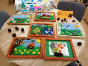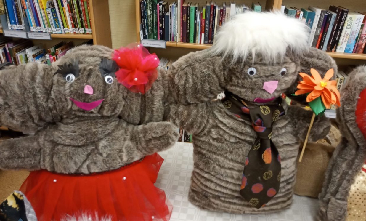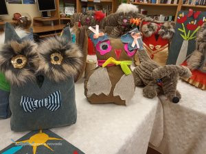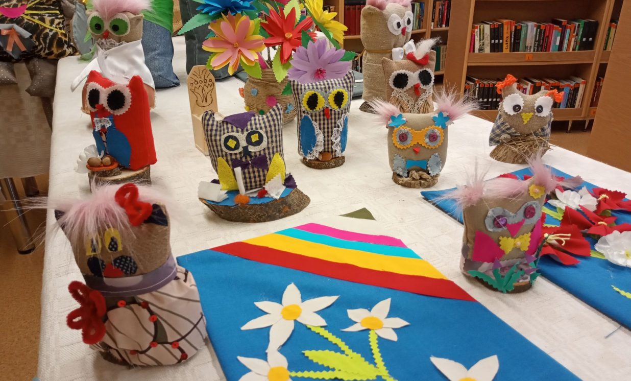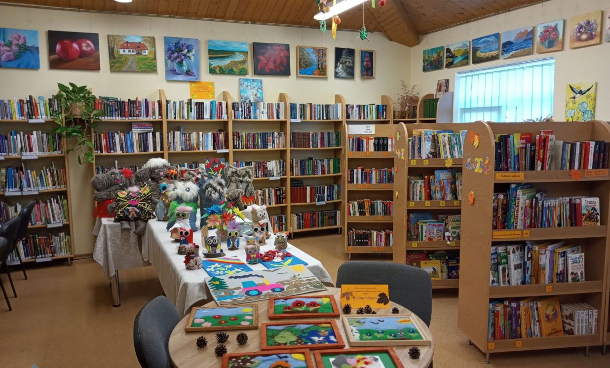 Bibliotēkā var aplūkot arī Višķu sociālās aprūpes centra, Dienas aprūpes centra klientu ar īpašām vajadzībām radošo darbu izstāde “Rudens brīnumi”, kas tapusi personām ar GRT projekta “Deinstitucionalizācijas pasākumu īstenošana Latgales reģionā” Nr. 9.2.2.1./15/I/005 ietvaros. Izstādē redzamie darbiņi izpildīti dažādās tehnikās, interesantie dzīvnieciņi, mazās pūcītes un filcētās glezniņas. Darbiņi izgatavoti no dažādu materiālu atgriezumiem, koka un kartona. Šeit var smelties idejas radošām darbnīcām. Bibliotēkai ir izveidojusies veiksmīga sadarbība ar Višķu dienas aprūpes centru un filcētās glezniņas tapušas radošā darbnīcā no vilnas. Paldies atraktīvajām un enerģiskajām Dienas centra darbiniecēm Svetlanai Miglānei un Terēzijai Aleksejevai par sadarbību un jauniem izaicinājumiem.