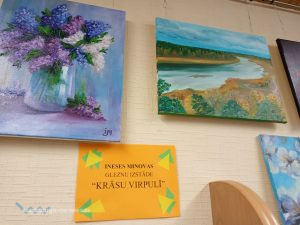 Ineses Minovas gleznu izstāde “Krāsu virpulī”. Izvietojot gleznas bibliotēkā sajutu mākslinieces pozitīvo enerģiju un siltumu, ko gleznas izstaro. Bibliotēkā kļūst mājīgi, telpa piepildās ar īpašu auru. Gleznās attēlotie ziedi, dabas skati, kaķis ir kā dzīvi un pēc sārtā ābola roka pastiepjas paņemt no galda.