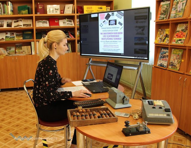 Izstādes prezentācijas laikā bibliotekāre ne tikai rādīja eksponātus, bet arī stāstīja interesantus faktus no skaitļošanas tehnikas vēstures. Bērni uzzināja, kas ir abaks, ko nozīme vārds calculus, kā izskatījās pirmie aritmometri un kā, ar viņiem strādāt. Laura Grigorjeva pastāstīja par saziņas tehnikas vēsturi un parādīja Alekseja Sokolova kolekcijā esošo telegrāfu, vecus telefona aparātus, tekstofonu u.c. tehniku, pastāstīja par morzas kodu. Nodarbības noslēguma skolēni atbildēja uz E-viktorīnas jautājumiem.