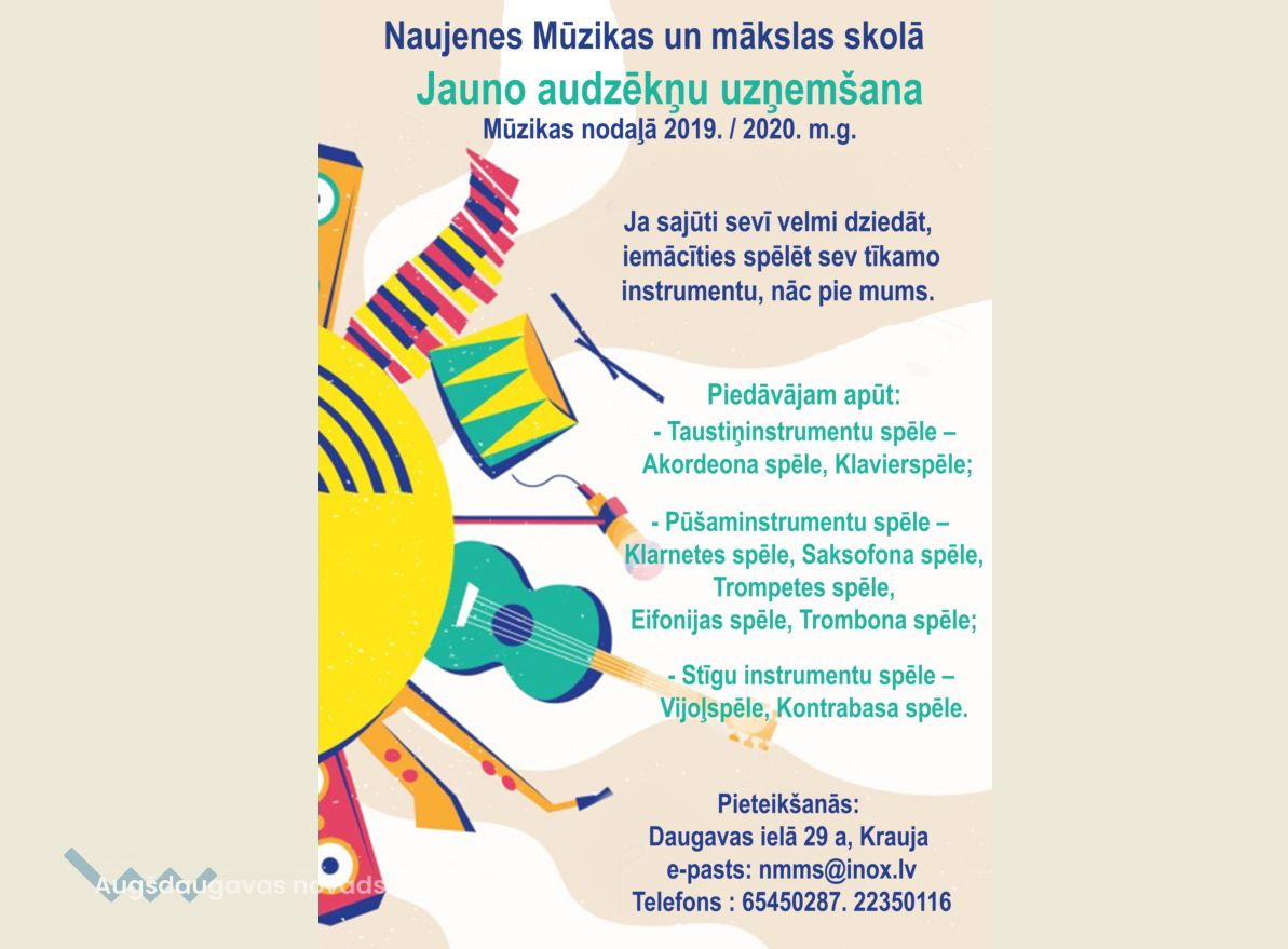 Naujenes Mūzikas un mākslas skola izsludina jauno audzēkņu uzņemšanu Mūzikas nodaļā 2019./2020. mācību gadam.