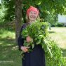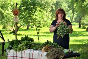 “Rainis teica, ka saules piesmēlies es visam mūžam, pietiks visai vasarai. Saules tiešām šovasar ļoti daudz. Tā ienāca doma muzeja parkā rīkot pirts slotu siešanas meistarklasi,” stāsta Raiņa mājas Berķenelē direktore Inese Bērziņa. “Mēs pazīstam bērzu un ozolu, bet man rokās ir ļoti dažādas zāles – gan vērmeles, gan piparmētras, pīlādzis un jasmīns. Un ļoti fantastiska ir liepa, kas jau zied. Daba mums dod mājienu, ka jāsāk gatavoties ziemai un jāsien slotiņas. Tāpēc mēs šodien uzaicinājām profesionālu pirtnieci Dzintu Abaroni, lai mums pastāsta, kā mums pareizi siet tās slotiņas un kādu materiālu izmantot.”