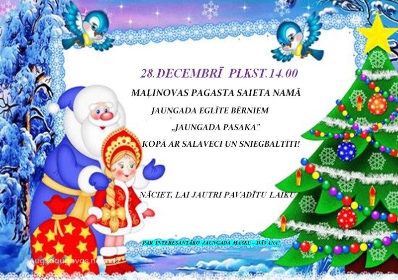 Jaungada eglīte Maļinovā20.12.2017Kultūra Maļinovas pagasta saieta nams aicina bērnus uz Jaungada eglīti! Spēlēsim spēles, dziedāsim jaungada dziesmas, iesim rotaļās kopā ar Salaveci un Sniegbaltīti!