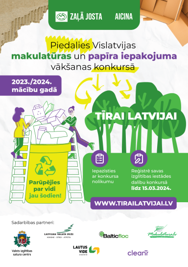 Ražotāju atbildības sistēmas uzņēmums “Zaļā josta” sadarbībā ar Valsts izglītības satura centru, atkritumu apsaimniekotāju “CleanR” un citiem partneriem ir uzsākusi kampaņu “Tīrai Latvijai”, kuras laikā skolēni, pirmsskolas vecuma bērni un viņu ģimenes locekļi izglītības iestādēs tiek aicināti vākt papīra iepakojumu, makulatūru un izlietotās baterijas, informē “Zaļās jostas” vides izglītības vadītāja Aija Caune.