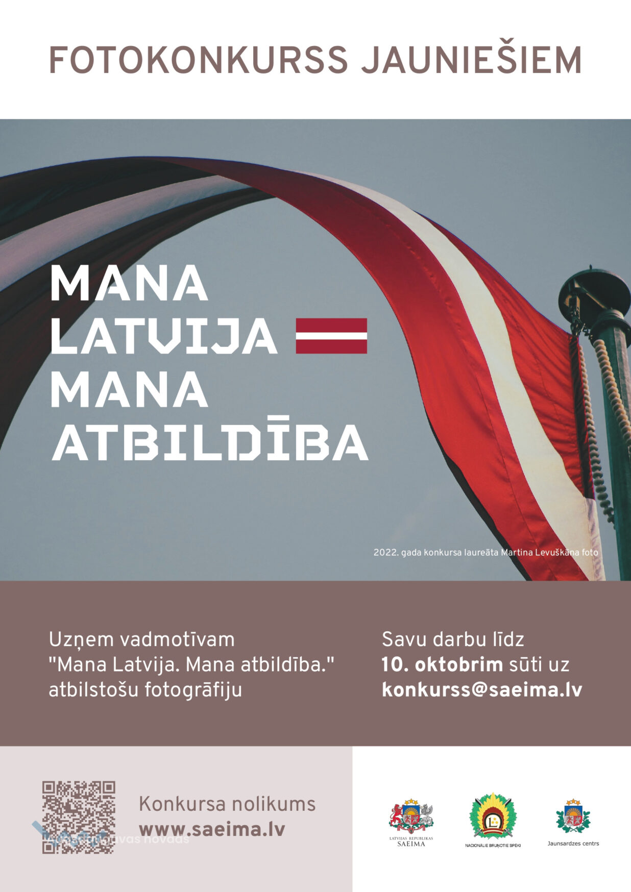 Lai veicinātu jauniešu izpratni par visaptverošas valsts aizsardzības nozīmi iedzīvotāju drošībai, sekmētu viņu radošās aktivitātes, kā arī iesaisti drošības sistēmas veidošanā, parlaments aicina 15–25 gadus vecus jauniešus piedalīties fotokonkursā “Mana Latvija. Mana atbildība.”.