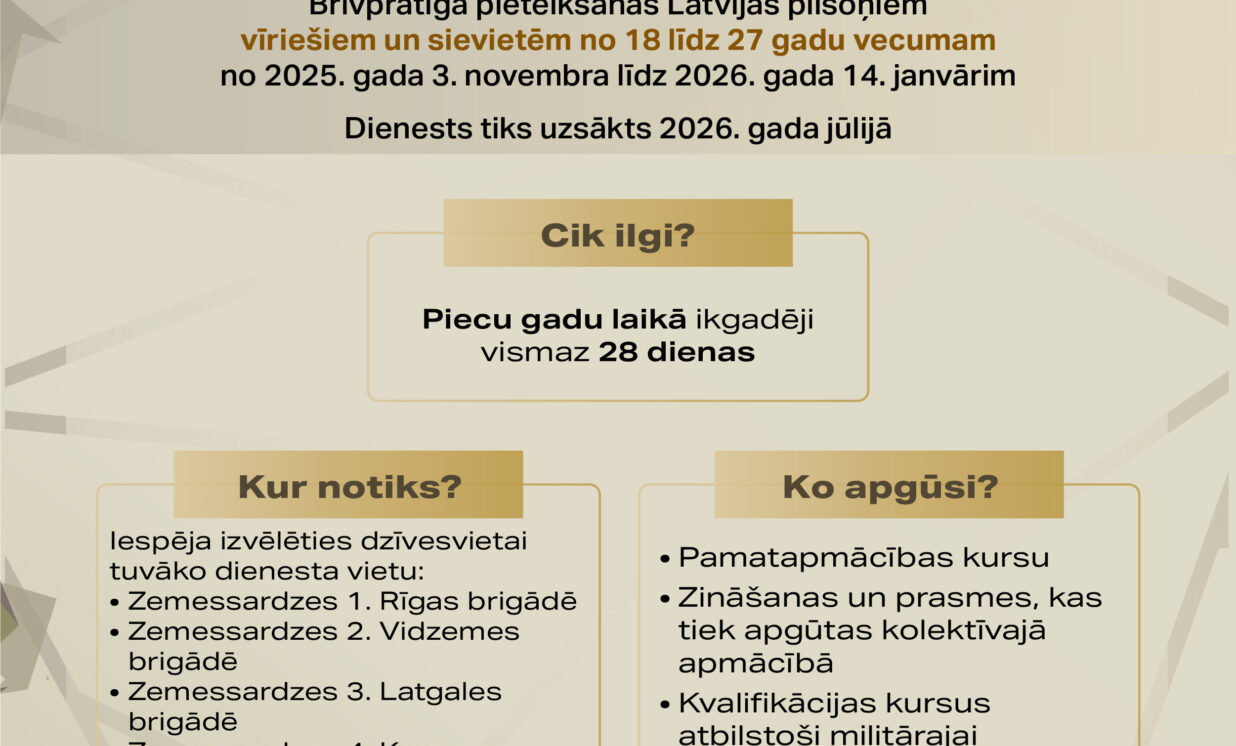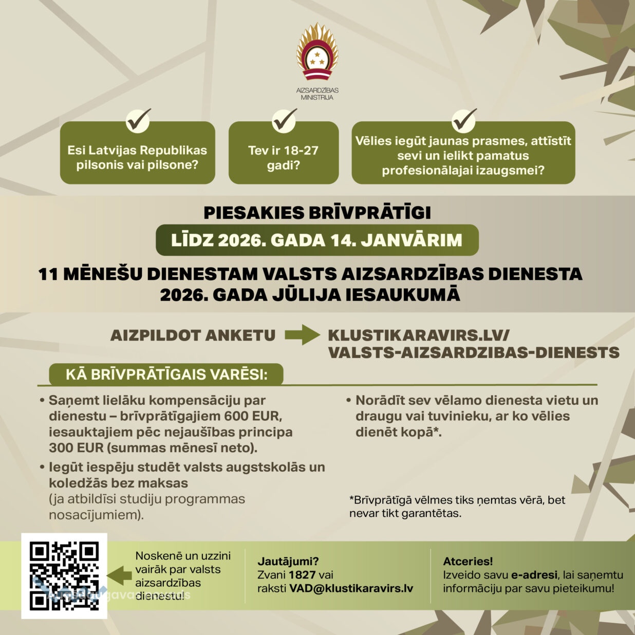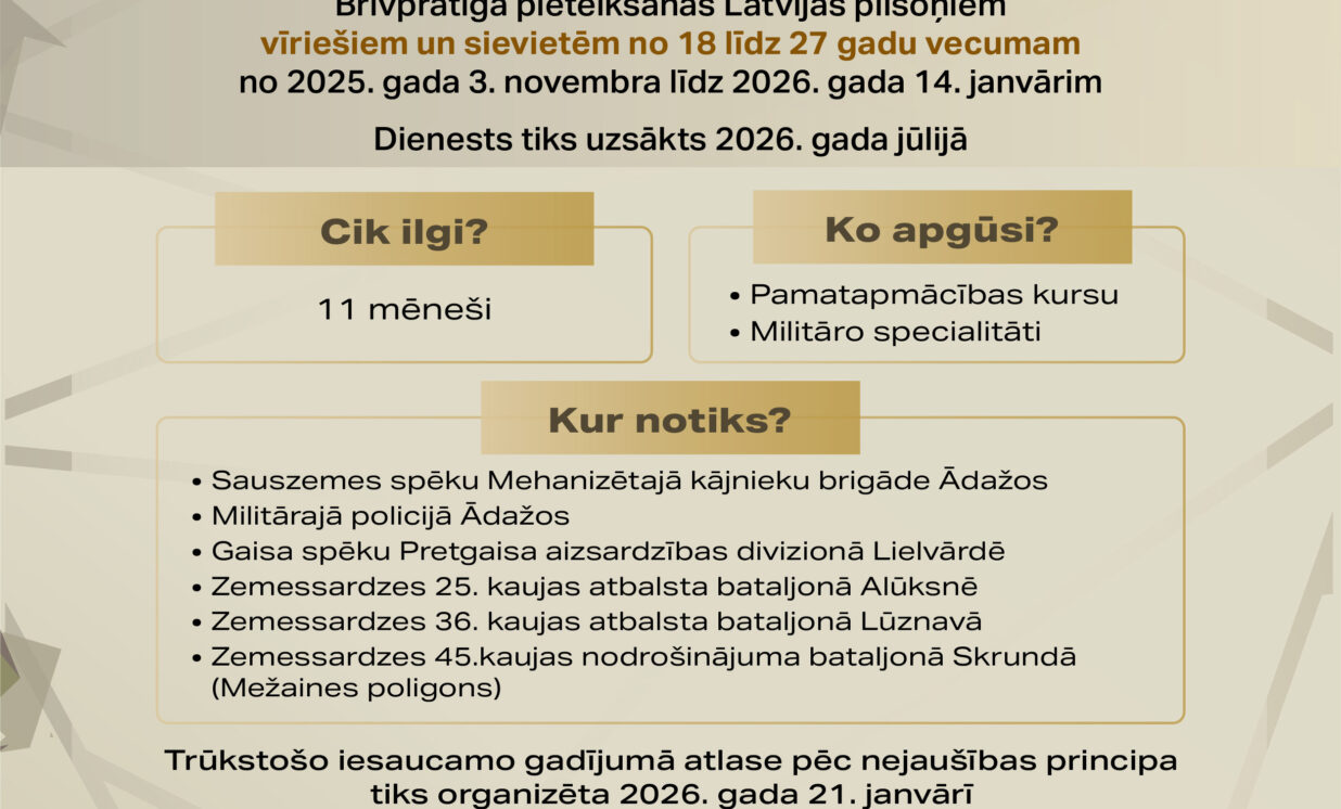 Aizsardzības ministrija no 2025. gada 3. novembra līdz 2026. gada 14. janvārim aicina Latvijas pilsoņus vecumā no 18 līdz 27 gadiem brīvprātīgi pieteikties valsts aizsardzības dienestam, kas tiks uzsākts 2026. gada jūlijā.
