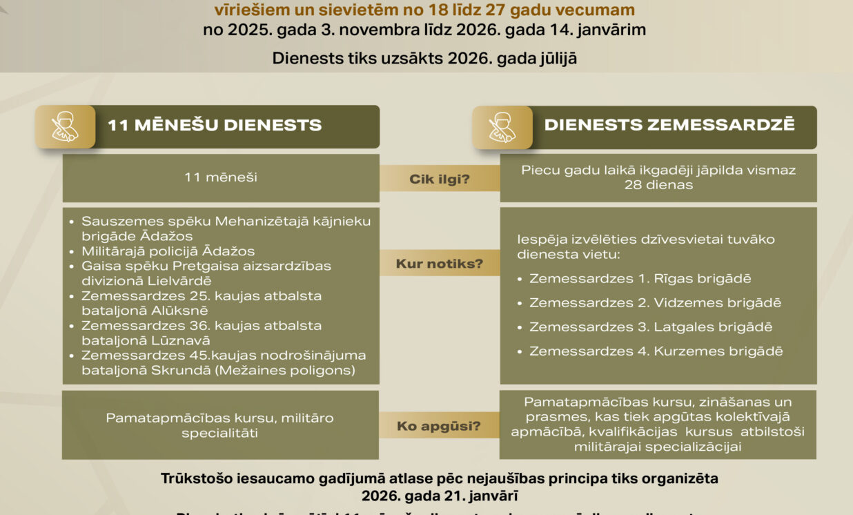 2026. gada jūlija iesaukumā 11 mēnešu militārajam dienestam nepieciešami 1470 jaunieši, kuri dienesta pienākumus pildīs Nacionālo bruņoto spēku vienībās. Savukārt 2026. gadā piecu gadu dienestam Zemessardzē brīvprātīgi var pieteikties līdz 700 jauniešiem.