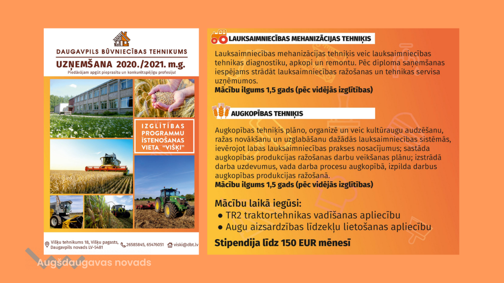 Daugavpils Būvniecības tehnikuma izglītības programmas īstenošanas vietā "Višķi" notiek jauniešu uzņemšana divās mācību programmās “Lauksaimniecības tehnika” ar kvalifikāciju lauksaimniecības mehanizācijas tehniķis un “Augkopība” ar kvalifikāciju augkopības tehniķis. Uzņemšana ilgs līdz 15. augustam, taču uz šo brīdi grupas jau praktiski ir nokomplektētas, atzīst izglītības programmas īstenošanas vietas "Višķi" direktore Anita Lāčauniece. Ņemot vērā, ka Višķos uzņemšana sākās krietni vēlāk nekā citās mācību iestādēs, rezultāti esot ļoti iepriecinoši. Daugavpils Būvniecības tehnikuma direktores vietniece izglītības jomā Oksana Soročina atgādina, ka no 1. jūlija Daugavpils Būvniecības tehnikums ir pārņēmis bijušo Malnavas koledžas izglītības programmu īstenošanas vietu “Višķi”. Tāpat tika pārņemts arī 4. kurss ar 15 izglītojamiem, kuri 1. septembrī turpinās mācības jau kā Daugavpils Būvniecības tehnikuma audzēkņi. Oksana Soročina atzīst, ka nākotnes perspektīvas ir diezgan ambiciozas, plānojot izglītības programmas īstenošanas vietas "Višķi" attīstību ilgtermiņā: “Šajā īsajā laika posmā esam paspējuši pieteikties pieaugušo izglītības projektā, un Višķos tiks izveidotas 5-6 izglītības programmas, kurās uzņemšana sāksies jau augusta beigās, bet rudenī tiks uzsāktas mācības pieaugušo izglītības grupās.” Sākot ar nākamo mācību gadu tiek plānots gatavot lauksaimniecības mehanizācijas tehniķus arī četrgadīgajā izglītības programmā, kas ir modulāra izglītības programma. “Tā būs četrgadīga izglītības programma, kas tiek finansēta no valsts budžeta. Tad arī Daugavpils Būvniecības tehnikumam būs daudz plašākas iespējas gan pilnveidot bāzi, gan infrastruktūru. Uzsvars tiks likts uz sadarbību ar darba devējiem, vietējām zemnieku saimniecībām un uz pieaugušo izglītību. Tāpēc nākošajā plānošanas periodā izglītības pamatnostādnēs ir ielikts tas, ka izglītībai ir jābūt pieejamai visiem,” saka O. Soročina. Struktūrvienības vadītāja Anita Lāčauniece uzsver, ka lauksaimniecības profesijas ir pieprasītas un darbu pēc tehnikuma absolvēšanas jaunie speciālisti var atrast tepat Latvijā gan zemnieku saimniecībās, gan dažādos lauksaimniecības uzņēmumos un servisos. Oksana Soročina piebilst, ka turpmāk tiks uzlabota saikne un sadarbība ar darba devējiem, lai jauniešiem būtu informācija, kur ir nepieciešamas darba rokas. “Jau vairākus gadus mēs rīkojam vakanču tirgu, kurp aicinām dažādus uzņēmumus, kuri piedāvā studentiem aktuālas vakances.” Daugavpils Būvniecības tehnikums pašlaik uzņemšanas plānu ir izpildījis pilnā ampērā, studētgribētāju skaits bija sasniedzis pat 750 izglītojamo. Izglītības īstenošanas vietā "Višķi" ir pilnībā nokomplektētas 2 mācību grupas ar 50 izglītojamajiem abās.“Ņemot vērā arī septembra uzņemšanu tajās programmās, kuras netiks nokomplektētas līdz 15. augustam, tad uz 1. oktobri kopā ar Višķiem varētu iziet uz 1400 izglītojamiem, kas būs vislielākais rādītājs pēdējos gados,” saka Oksana Soročina. Pārņemot izglītības iestādi, tika saglabātas visas darbavietas tiem darbiniekiem, kuri vēlējās turpināt strādāt, un ar 1. jūliju ir noslēgti jauni darba līgumi. Taču Oksana Soročina uzskata, ka vēl papildus būs jāpiesaista pedagogi, jo parādījās jaunas modulārās izglītības programmas, tāpat tiks piesaistīti arī Daugavpils Būvniecības tehnikuma esošie pedagogi. Perspektīvā ir plānots uzlabot arī tehnikuma iekštelpu vizuālo stāvokli, piesaistot savus studentus, kuri apgūst būvniecības specialitātes. Mācību prakses laikā audzēkņi varēs veikt praktiskās apmācības, veicot iekštelpu remontu. Daugavpils novada domes izpilddirektore Vanda Kezika uzsver, ka tiks izmantota iespēja piedalīties energoefektivitātes uzlabošanas projektos, lai sakārtotu ēkas arī no ārpuses. Sadarbībā ar Daugavpils Būvniecības tehnikumu tiks veikta izglītības programmu īstenošanas vietas “Višķi” ēku inventarizācija, lai saprastu, kādas ēkas un telpas ir nepieciešamas un saglabājamas. Atgādinām, ka uzņemšana mācību programmās turpinās līdz 15. augustam! Mācību programmas: Lauksaimniecības tehnikakvalifikācija – lauksaimniecības mehanizācijas tehniķisAugkopībakvalifikācija – augkopības tehniķisIegūsi TR2 traktortehnikas vadīšanas apliecību, augu aizsardzības līdzekļu lietošanas apliecību! Mācību ilgums: 1,5 gads ar vispārējo vidējo izglītību (bez vecuma ierobežojuma) Stipendija līdz 150 EUR mēnesī Dokumentu iesniegšana darbadienās no plkst. 8.30 līdz 15.00 Iesniedzamie dokumenti: iesniegums, izglītības dokuments, sekmju izraksts, medicīniskā izziņa, 4 foto 3x4cm, personu apliecinošs dokuments, konta numurs