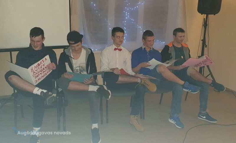 Jaunieši sociālajos tīklos aktīvi pievieno storijus, un ar savu stāstu par to, kā jaunieši svin 8.marta svētkus savā pagastā, mūs iepazīstināja brīnišķīgās Salienas pagasta jaunietes. Tāpat, jaunieši aktīvi izliek translācijas un mēs visi varējām vērot asprātīgo tiešraidi no Dubnas pagasta jauniešiem par to, kā viņi gatavojās braukt pie mums uz pasākumu. Vakara gaitā jauniešiem tika piedāvāta iespēja spēlēt spēles un piedalīties konkursos, atcerēties dažus Daugavpils novada jaunatnes skaistākos mirkļus aplūkojot fotogrāfijas. Brīnišķīgu un īpaši skaistu svētku atmosfēru bija izdevies radīt Maļinovas pagasta jaunietēm Diānai Pilipecai, Valērijai Ciršai, Aleksandrai Vereščaginai un Annai Puškarjovai izpildot romantiskas dziesmas ģitāru pavadībā. Un, protams, kur tad bez ziediem 8.marta svētkos.