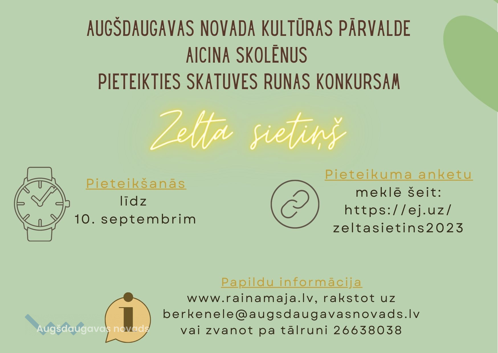 Augšdaugavas novada Kultūras pārvalde aicina pieteikties skatuves runas konkursam “ZELTA SIETIŅŠ”, kas notiks 22. septembrī Augšdaugavas novada kultūras centā „Vārpa”.