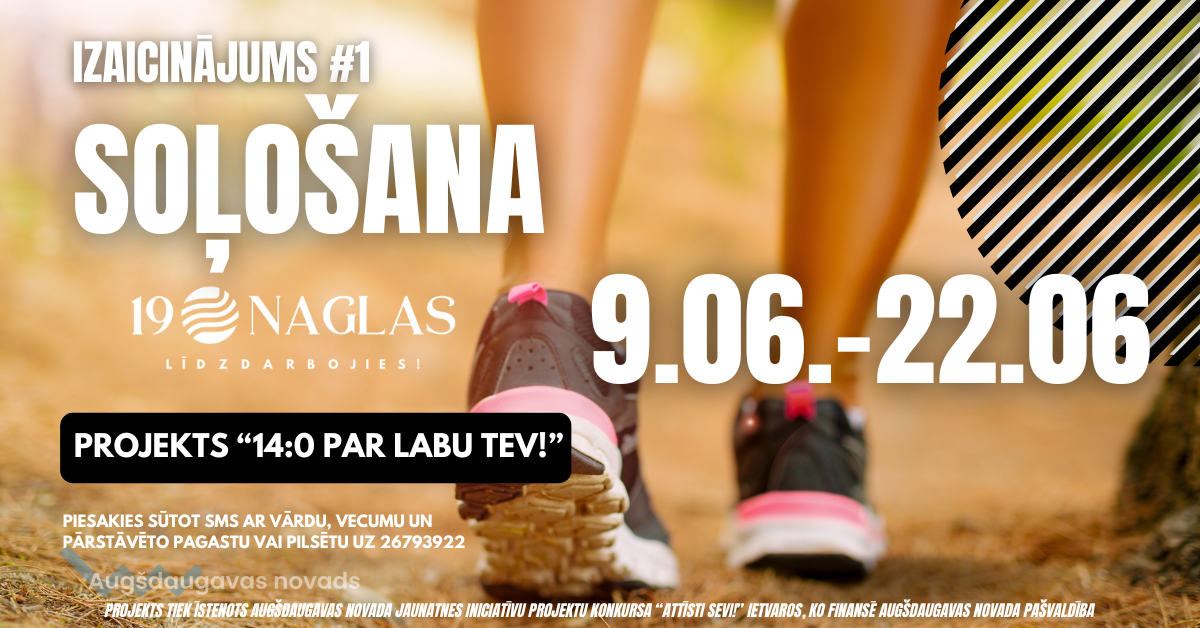Biedrība “19 naglas” projekta “14:0 par labu Tev!” ietvaros organizē dažāda veida izaicinājumus, kas motivē kustēties un būt aktīviem. Jau 9.jūnijā jaunieši un visi interesenti aicināti piedalīts 2 nedēļu soļošanas izaicinājumā.