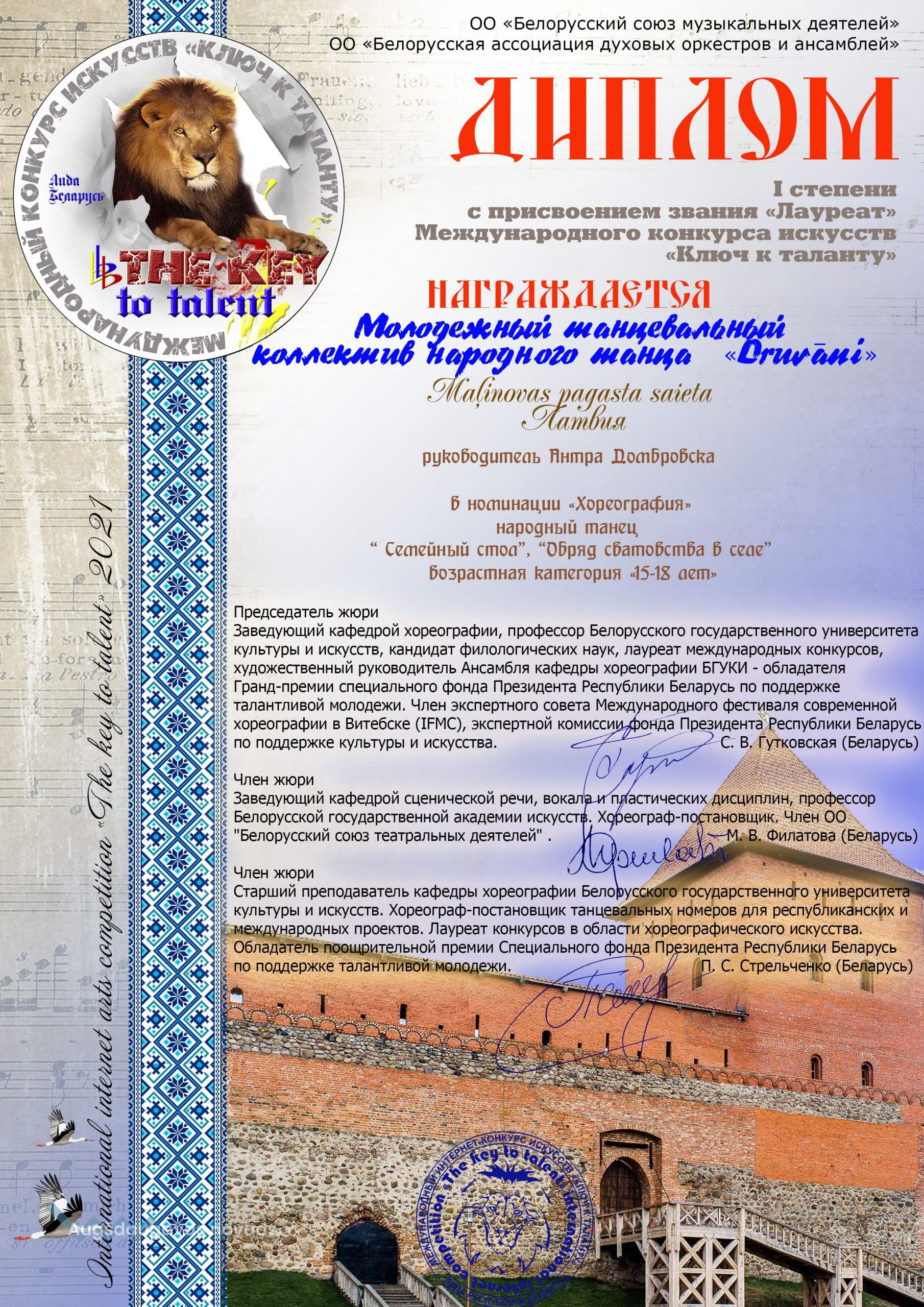 Starptautiskajā konkursā "The key to talent", kura organizatori ir Baltkrievijas puse, jauniešu deju kolektīvam "Druvāni" iegūts I pakāpes diploms nominācijā "Horeogrāfija" (15 - 18 gadu grupā).