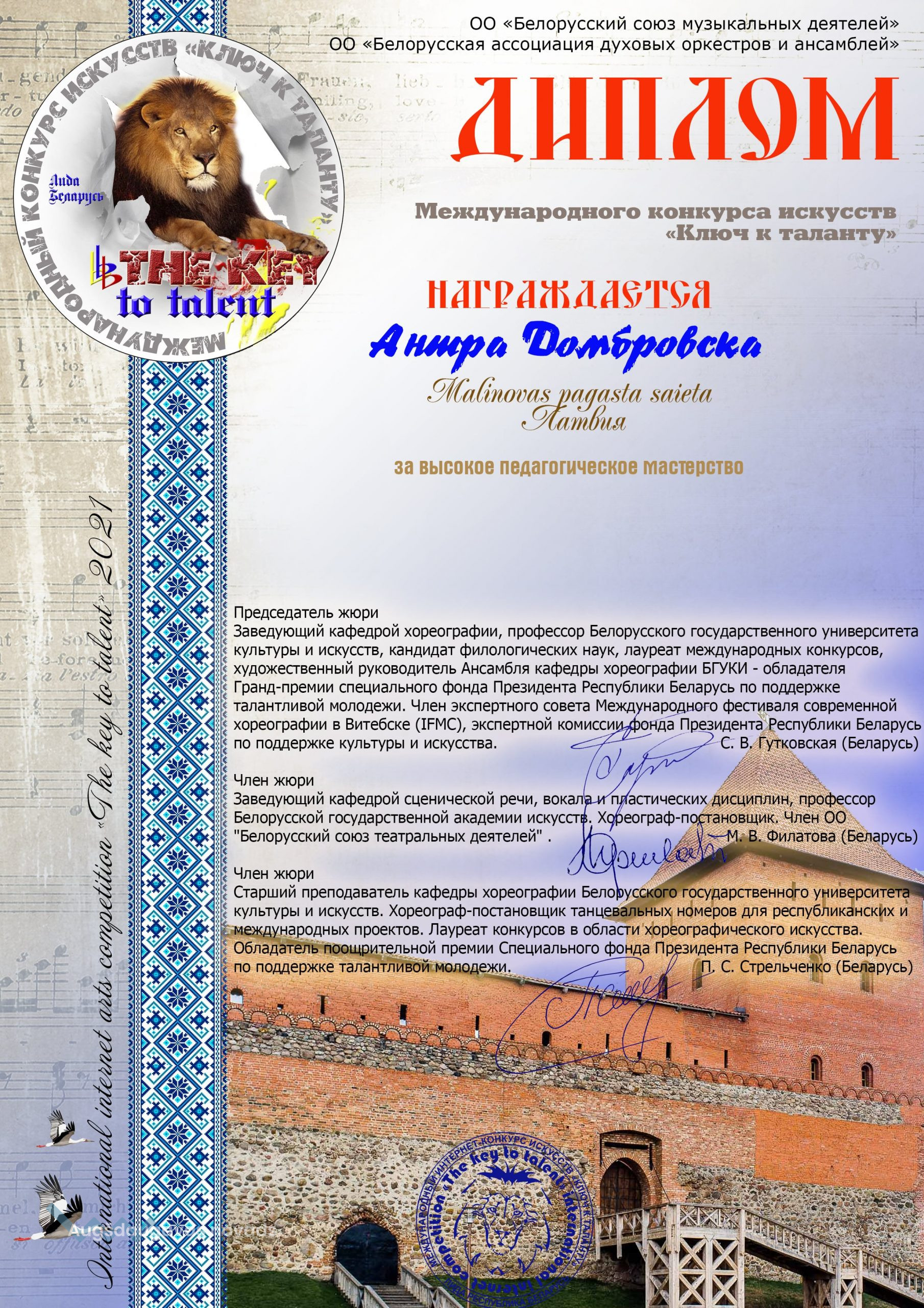 Tāpat konkursa diploms tika pasniegts Antrai Dombrovskai par "Augstu pedagoģisko meistarību".