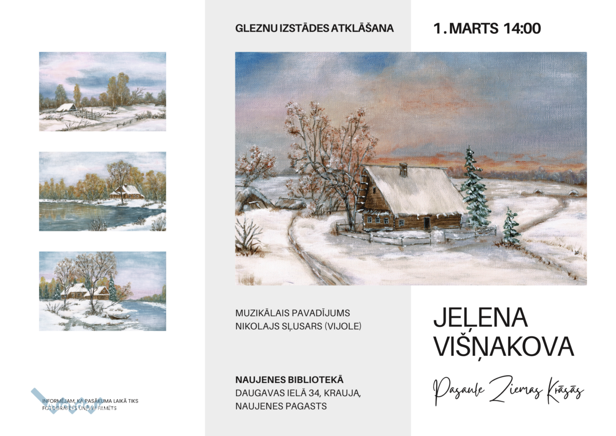 1. martā plkst.14.00 tiks atklāta Naujenes bibliotēkas bibliotekāres Jeļenas Višņakovas pirmā personāizstāde "Pasaule ziemas krāsās". Pasākums notiks Naujenes bibliotēkas Iedvesmas zālē, Daugavas ielā 34, Krauja, Naujenes pagastā. T. 654 50246.
