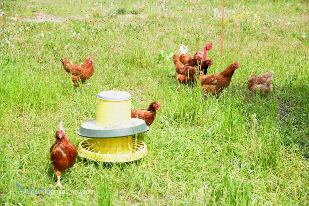 Paši saimnieki mājputnus jokojot sauc par laimīgajām vistām, jo tām tiek ļauta diezgan liela brīvība, dzīvojoties aplokā zem klajas debess. Turpat atrodas neliela mobila vistu kūts, kur vistas pārlaiž nakti un dēj olas. Barotavās tiek bērta bioloģiska barība, graudi un neliela kombinētās spēkbarības deva. Ik pēc pāris dienām aploks ar visu kūtiņu tiek pārvietots atkarībā no tā, cik ātri vistas noēd vai nomīda zāli. Šādas pārvietojamas mājputnu novietnes ideju Juris aizguvis no Eiropā pazīstama atjaunojošās lauksaimniecības praktiķa Ričarda Perkina.