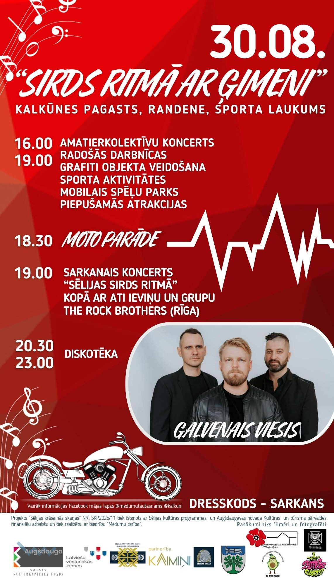 Vakara kulminācijā plkst. 19.00 sarkanais koncerts “Sēlijas sirds ritmā”. Uz skatuves kāps Atis Ieviņš ar grupu “ROCK BROTHERS” ar pasaules un latviešu iemīļotajiem roka hītiem. Pēc tam ballīte turpināsies ar diskotēku un pasaules hītiem līdz pat plkst. 23.00.