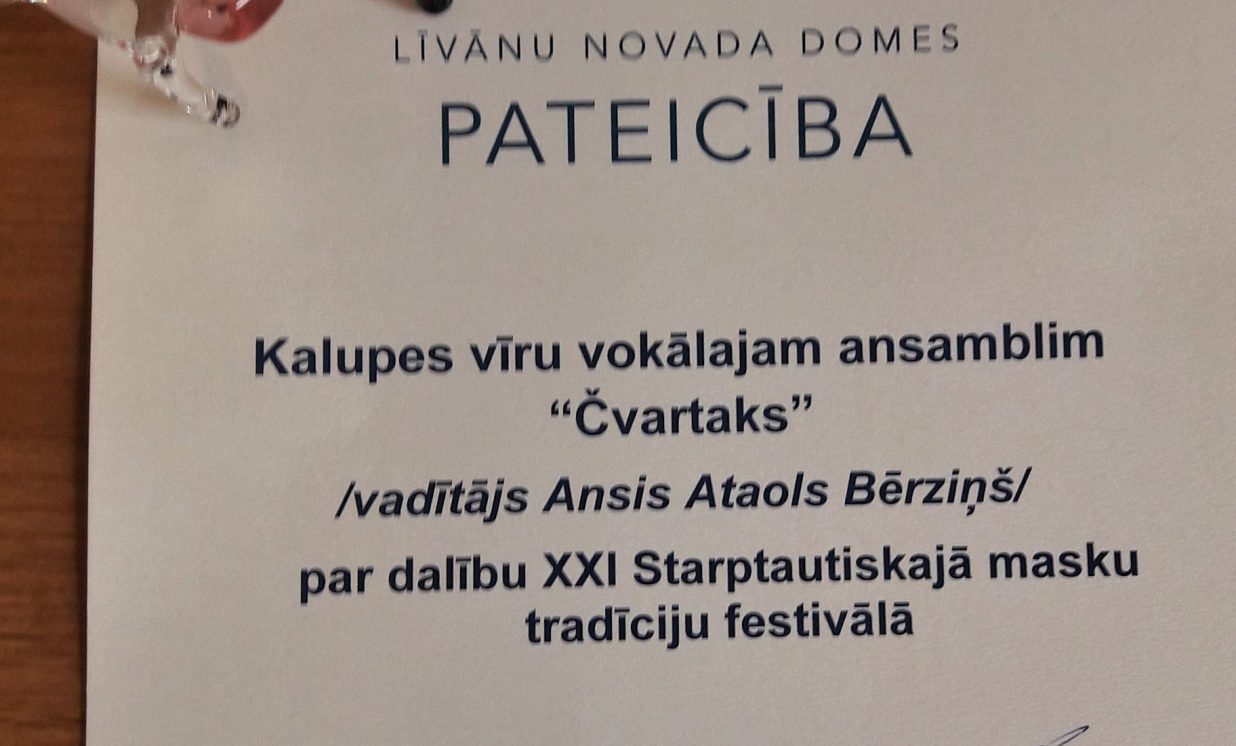 15. februārī Kalupes vīru vokālais ansamblis ,,Čvartaks” devās uz Līvāniem, lai piedalītos īpaši vērienīgā pasākumā - XXI Starptautiskajā masku tradīciju festivālā. Lielākais masku gājiena cikls ir saistīts ar Meteni - dienu, kad lācis griežas uz otriem sāniem un sākas jauns saimnieciskais gads. Kopš senseniem laikiem gada tumšā puse latviešiem ir maskošanās laiks. Ikviena maska ir logs uz citu pasauli, kas ļauj nonākt saskarsmē ar senču gariem un kosmiskiem spēkiem.