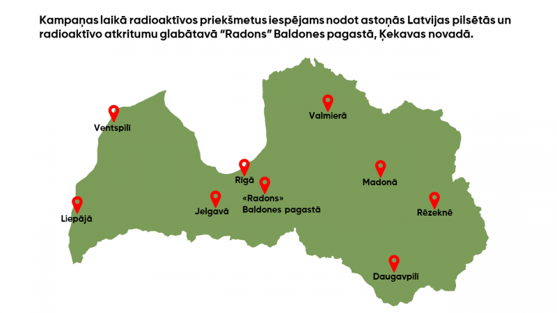 Radioaktīvus priekšmetus par maksu varēs nodot arī pēc kampaņas radioaktīvo atkritumu glabātavā “Radons”, Baldones pagastā, Ķekavas novadā, ko apsaimnieko VSIA “Latvijas Vides, ģeoloģijas un meteoroloģijas centrs” (tālr.: 67032620, 67032665, e- pasts: klientu.serviss@lvgmc.lv)