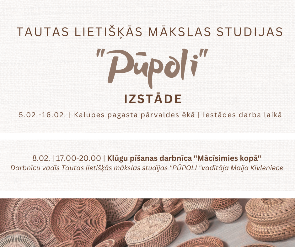 Izstādē būs apskatāmi tautas lietišķās mākslas studijas “PŪPOLI” dalībnieču darbi. Darbnīcā no plkst. 17.00 - 20.00 kopā ar studijas vadītāju Maiju Kivlenieci un dalībniecēm varēs apgūt pinumu darināšanas prasmes.
