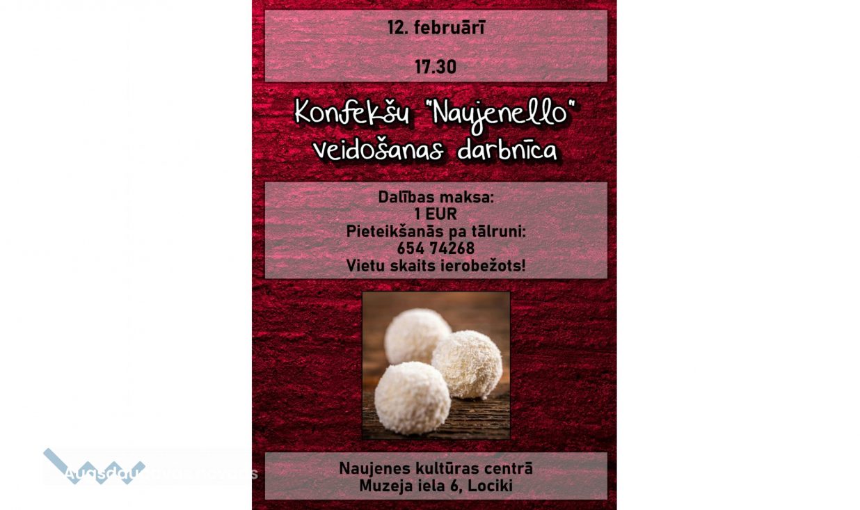 Piezvani mums pa tālruni 65474268 un piesaki sevi un savus draugus konfekšu veidošanas darbnīcai, kas notiks 12. februārī, plkst. 17.30 Naujenes kultūras centrā. Atnākot uz darbnīcu būs jāziedo TIKAI VIENS maziņš un foršs EIRIKS, taču aizejot, Jūs iegūsiet DAUDZ vairāk. VIETU SKAITS IEROBEŽOTS – tāpēc pasteidzies!