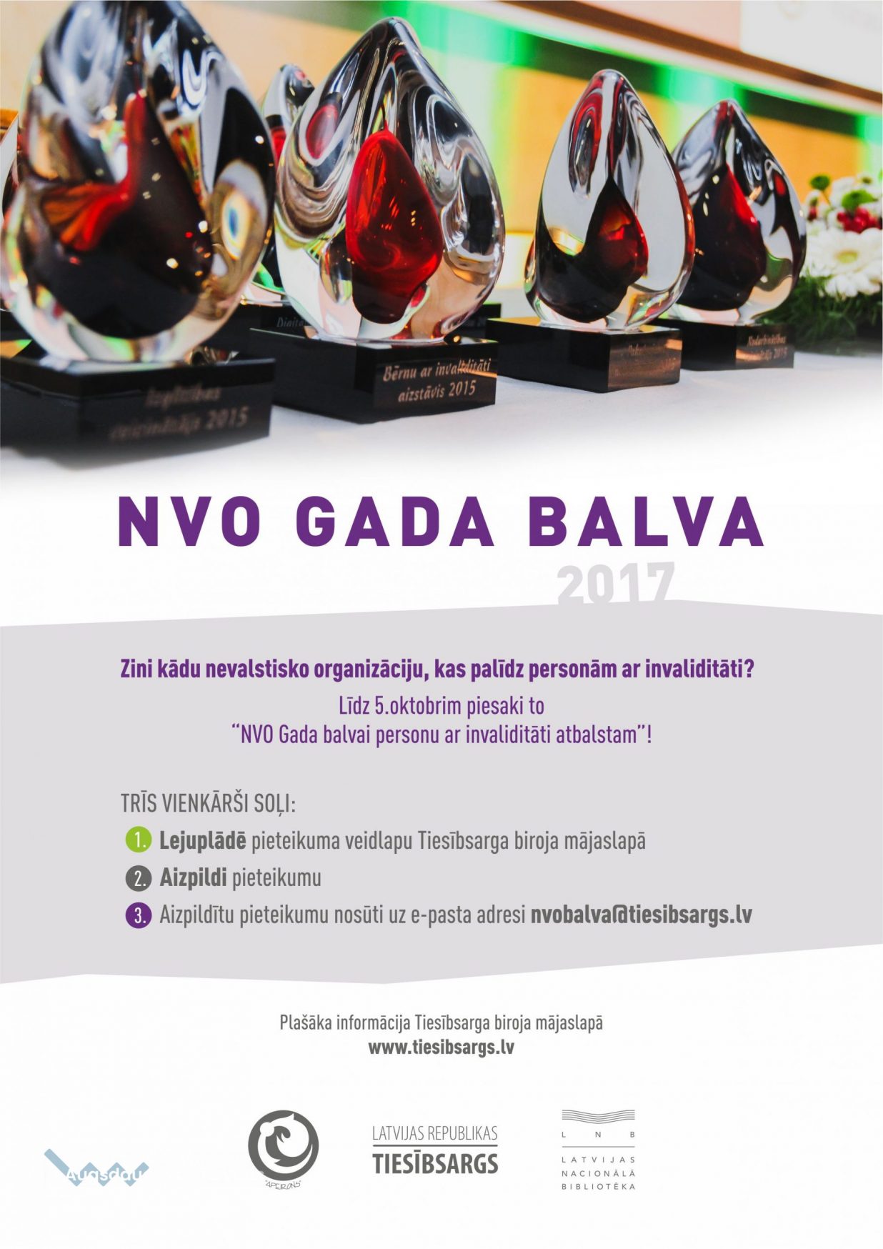 Tiesībsarga birojs, izrādot valsts pateicību nevalstiskajām organizācijām (NVO), jau trešo gadu rīko NVO konkursu "Gada balva personu ar invaliditāti atbalstam".