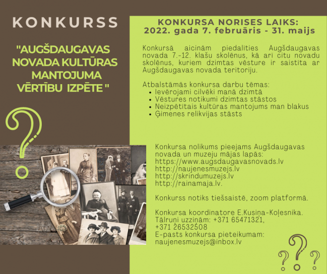 No 2022. gada 7. februāra līdz 31. maijam Augšdaugavas novada Kultūras pārvalde aicina 7. – 12. klašu skolēnus piedalīties konkursā “Augšdaugavas novada kultūras mantojuma vērtību izpētes konkurss”. Konkursa mērķis ir vairot Augšdaugavas novada iedzīvotāju izpratni un zināšanas par sava novada bagāto kultūras mantojumu, saglabājot un popularizējot kultūrvēsturisko mantojumu un ar to saistītās nemateriālās un materiālās liecības, īpašu uzmanību pievēršot dzimtu stāstiem, vietējām tradīcijām un sadarbībai ar šo tradīciju kopējiem, lokālai vēsturei un dažādu novada vēsturisku faktu apzināšanai un izpētei. Pētniecības darbu var veikt vairākos virzienos: apzināt un izpētīt ievērojamus cilvēkus savā dzimtā, izzināt dažādus vēstures notikumus un apzināt no paaudzes paaudzē nodoto priekšmetu – dzimtas relikviju – stāstus. Ir vērts palūkoties sev apkārt, jo varbūt tieši jūsu dzimta glabā vēsturiskas liecības par kādu neizpētītu kultūras mantojumu savā vai kaimiņu sētā, dzimtajā ciemā, pagastā vai novadā.
