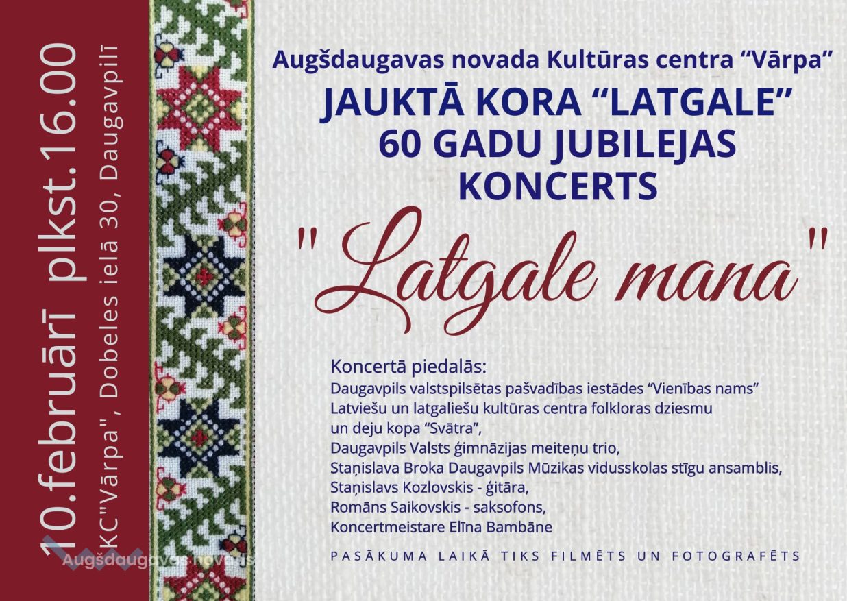 10. februārī plkst. 16.00 Augšdaugavas novada Kultūras centrā „Vārpa” (Dobeles ielā 30, Daugavpilī) notiks jauktā kora „Latgale” 60 gadu jubilejas koncerts „Latgale mana”.