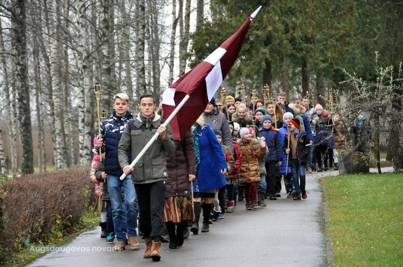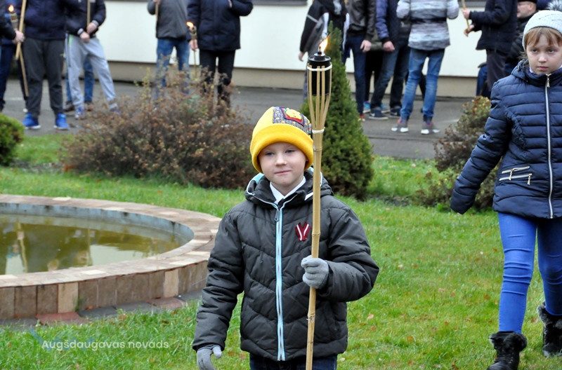 Ar Daugavpils novada izglītības iestāžu audzēkņu vizuālās mākslas darbu izstādi “Krāsainā Latvija” atklāšanu un sarkanbaltsarkano lentīšu locīšanu tika ieskandināta Patriotu nedēļa Daugavpils novadā. Blakus šiem pasākumiem Valsts 99. gadskārtas gaidīšanas laiks iesācies arī novada skolās un citās iestādēs. Tā, Naujenes pamatskolas kolektīvs, kā nu jau pēdējo četru gadu laikā, pulcējās, lai ietu kopīgā lāpu gājienā apkārt skolai. Ar īpašu patriotismu Valsts svētkus gaida jaunās paaudzes pārstāvji, savukārt skolotāji šo svētku sajūtu un piederību valstij viņos ieaudzina. Naujenes pamatskolas skolotāja Zinaīda Pauliņa pavēstīja, ka gan par 18. novembri, gan par 11. novembri un citiem Latvijas tautai nozīmīgiem datumiem un atceres dienām katru gadu stāsta pamatskolas vēstures skolotāja Inga Čalenko. Skolā notiek arī dažādi pasākumi Latvijas zīmē un, protams, lāpu gājiens, kuru katru reizi ar nepacietību gaida gan paši mazākie, gan arī vecāko klašu skolēni. Skolotāja Zinaīda uzskata, ka patriotismu skolēnos ir jāieaudzina ar labiem piemēriem, darot labus darbus. Savukārt labos darbus ir jāparāda citiem. Viņa ir pārliecināta, ka patriotisma gars un latviskā dzīves dziņa nāk, pirmām kārtām, no ģimenes un tikai tad no skolas. Lapu gājienā iedegtā liesma sasilda pagātni, bez kuras nebūtu iespējama mūsu tagadne un Latvijas nākotne.
