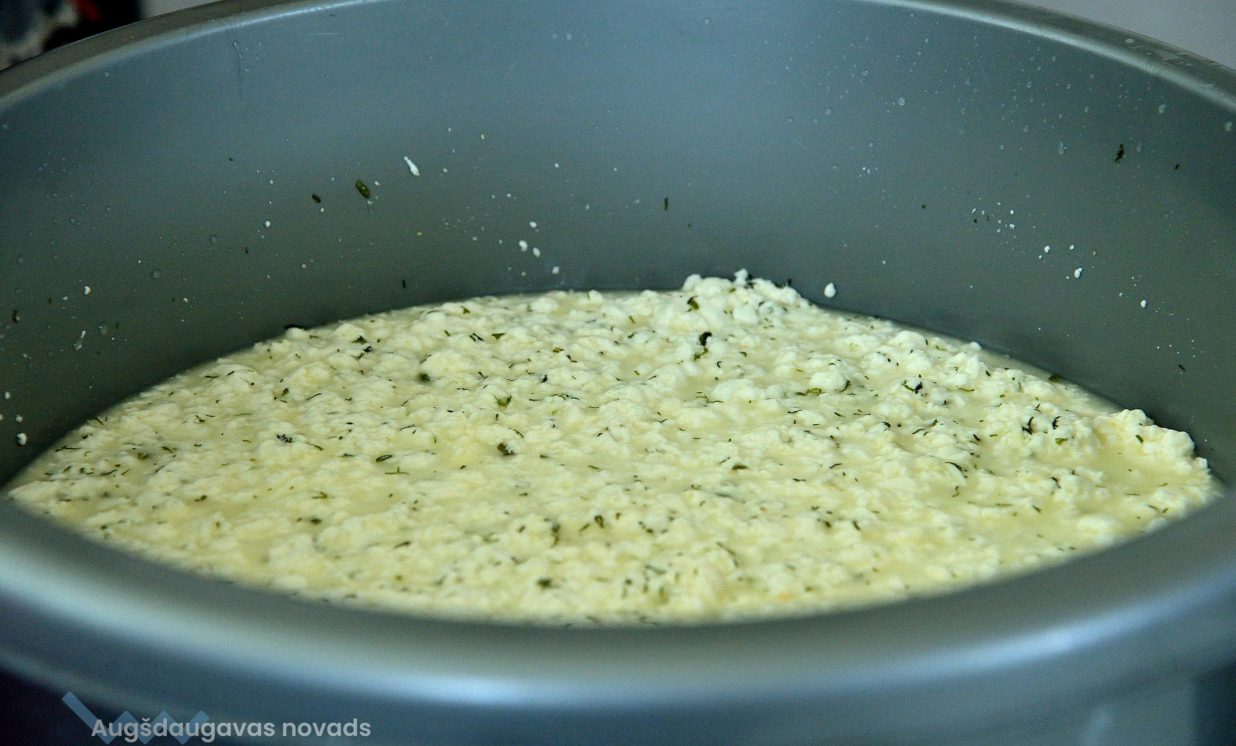 Savukārt baltais siers, kura pagatavošanu varēja vērot Kulinārās telpas virtuvē, tiek pagatavots no skābpiena, kam klāt garšai – ķiplociņš un dilles – kaltētas vai svaigi grieztas. Ja grib nedaudz asāku garšu, klāt var pievienot arī sarkanos piparus. Anna Rubine stāsta, ka agrākos laikos bieži vien vārījuši tieši šo sieru.