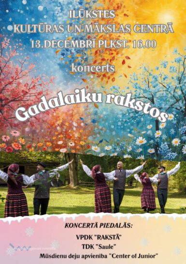 13. decembrī 16.00 Ilūkstes Kultūras un mākslas centrā Rīgas vidējās paaudzes deju kolektīva “Rakstā” koncerts “Gadalaiku rakstos”