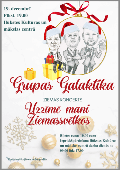 19. decembrī 19.00 Grupas “Galaktika” Ziemas koncerts “Uzzīmē mani Ziemassvētkos”. Biļetes cena 10,00 euro. Iepriekš pārdošanā no 8. decembra Ilūkstes Kultūras un mākslas centrā darba dienās no 9.00-17.00.
