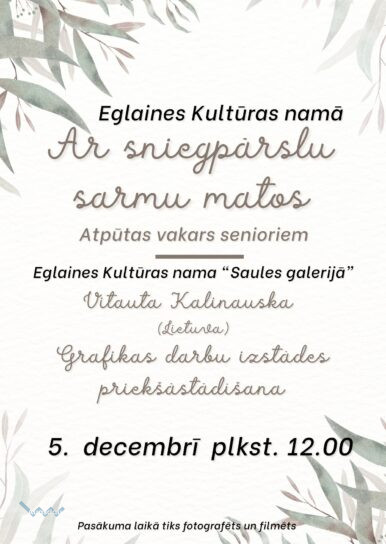 5. decembrī 12.00 Eglaines Kultūras namā atpūtas vakars senioriem “Ar sniegpārslu sarmu matos”, Vitauta Kalinauska (Lietuva) grafikas darbu izstādes atklāšana
