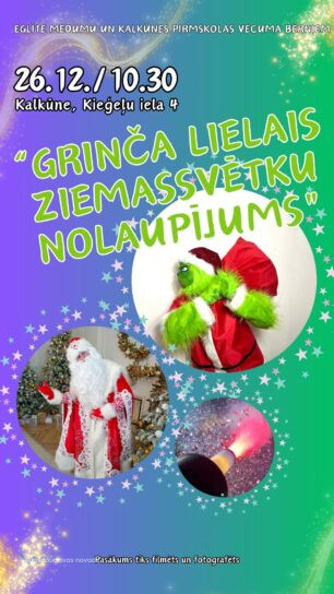 26. decembrī 10.30 Ķieģeļu ielā 4 eglīte Medumu un Kalkūnes pirmsskolas vecuma bērniem “Grinča lielais Ziemassvētku nolaupījums” kopā ar BOOM Time.