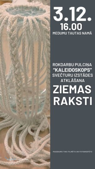 3. decembrī 16.00 Medumu Tautas nama foajē Medumu rokdarbu pulciņa “Kaleidoskops” svečturu izstādes “Ziemas raksti” atklāšana