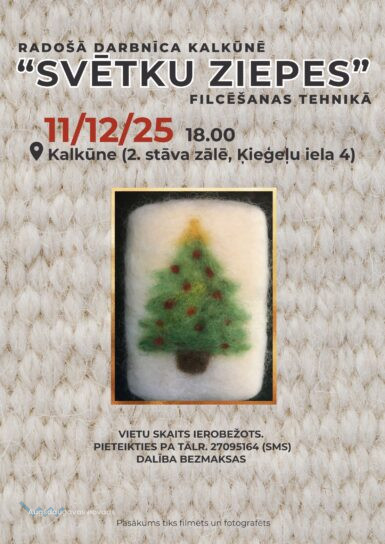 11. decembrī 18.00 Kalkūne (2. stāva aktu zālē, Ķieģeļu iela 4) radošā darbnīca “Svētku ziepes” filcēšanas tehnikā. Darbnīca pieaugušajiem. Pieteikties pa tālr. 27095164 (sms)