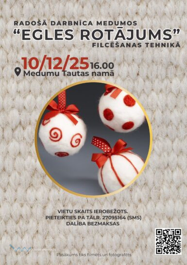 10. decembrī 16.00 Medumu Tautas namā radošā darbnīca “Egles rotājums” filcēšanas tehnikā. Darbnīca paredzēta pieaugušajiem. Pieteikties pa tālr. 27095164 (sms)