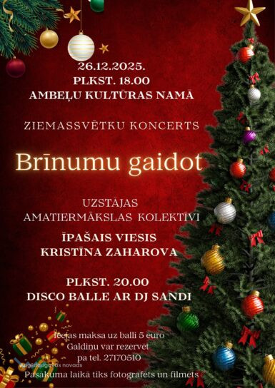 26. decembrī 18.00 Ambeļu Kultūras namā Ziemassvētku koncerts, 20.00 discoballe, ieejas maksa 5 euro