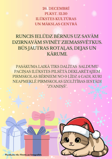 26. decembrī 12.30 Ilūkstes Kultūras un mākslas centrā Ziemassvētku saldumu paciņu saņemšana Ilūkstes pilsētā deklarētajiem pirmskolas vecuma bērniem no 0 līdz 4 gadi, kuri neapmeklē pirmsskolas izglītības iestādi “Zvaniņš”