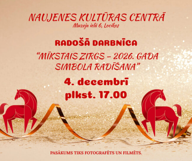 4. decembrī 17.00 Naujenes Kultūras centrā radošā darbnīca “Mīkstais zirgs - 2026. gada simbola radīšana", pieteikšanās pa tālr.26293212