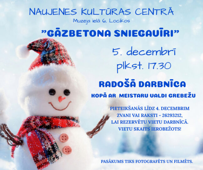 5. decembrī 17.30 Naujenes Kultūras centrā Radošā darbnīca ar meistaru Valdi Grebežu “Gāzbetona Sniegavīri”, pieteikšanās pa tālr.26293212