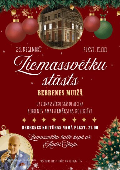 19. decembrī 18.00 Bebrenes Kultūras namā “Ziemas andele” un Maijas Bērziņas gleznu izstādes noslēgums. 25. decembrī 15.00 Bebrenes muižā koncerts “Ziemassvētku stāsts” , 21.00 Bebrenes Kultūras namā Ziemassvētku balle ar Andri Skuju.