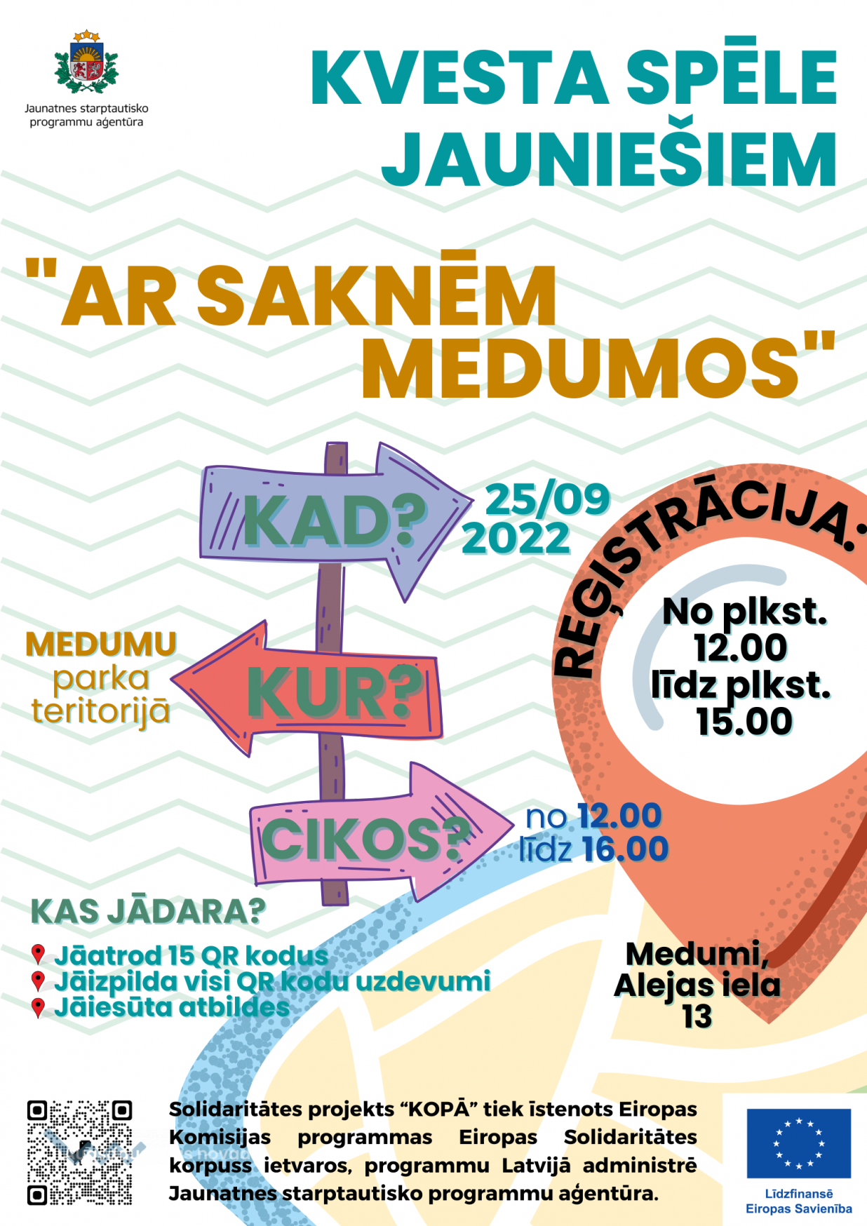 Kvesta spēle “Ar saknēm Medumos” norisināsies 2022. gada 25. septembrī Medumos, Medumu parka teritorijā. Piedalīties kvesta spēlē var no plkst. 12:00 līdz plkst. 15:00. Aktivitātes laikā aicinām ik katru doties dabā, lietderīgi pavadīt savu brīvo laiku kopā ar ģimeni, lieliski izklaidēties un iepazīt Medumu pagasta vēsturi kopā ar Mums. Kvesta uzdevums ir atrast visus noslēptos 15 QR kodus, atšifrēt katru QR kodu un izpildīt pareizi visus uzdevumus. Pirms doties kvesta spēlē, Jums ir jāpārliecinās, vai Jūsu viedierīce nolasa QR kodus, vai jāielādē kāda no QR kodu nolasīšanas programmām. Neaizmirstat, ka Jums būs nepieciešams interneta pieslēgums, lai izpildītu uzdevumus. Reģistrēties kvesta spēlei “Ar saknēm Medumos” var 25.septembrī no plkst. 12:00 līdz 15:00 Medumu jauniešu centra telpās, Alejas ielā 13. Katrs dalībnieks, kurš izpildīs visus kvesta uzdevumus, saņems Kalkūnes jauniešu attīstības centra jauniešu sagatavoto nelielu balvu. Kvesta spēle tiek organizēta Eiropas Solidaritātes korpusa projekta “Kopā” ietvaros. Sīkāku informāciju par kvesta spēli “Ar saknēm Medumos” vari saņemt rakstot uz e-pastu natalija.polovaja@augsdaugavasnovads.lv vai andrejs.rucko@augsdaugavasnovads.lv vai zvanot pa telefonu +371 28469958