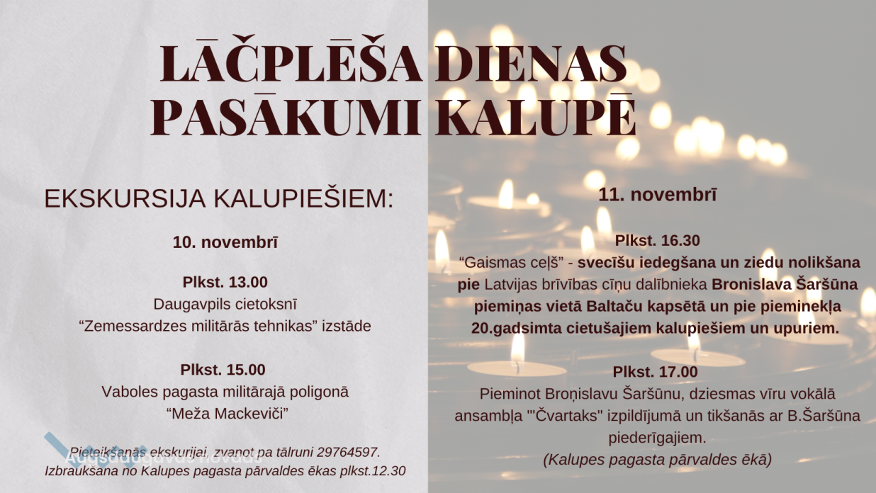 11.novembrī plkst.16.30 aicinām kalupiešus piedalīties aktivitātē “Gaismas ceļš” – svecīšu iedegšana un ziedu nolikšana Bronislava Šaršūna – Latvijas brīvības cīņu dalībnieka piemiņas vietā Baltaču kapsētā un pie pieminekļa 20.gadsimta cietušajiem kalupiešiem un upuriem.
