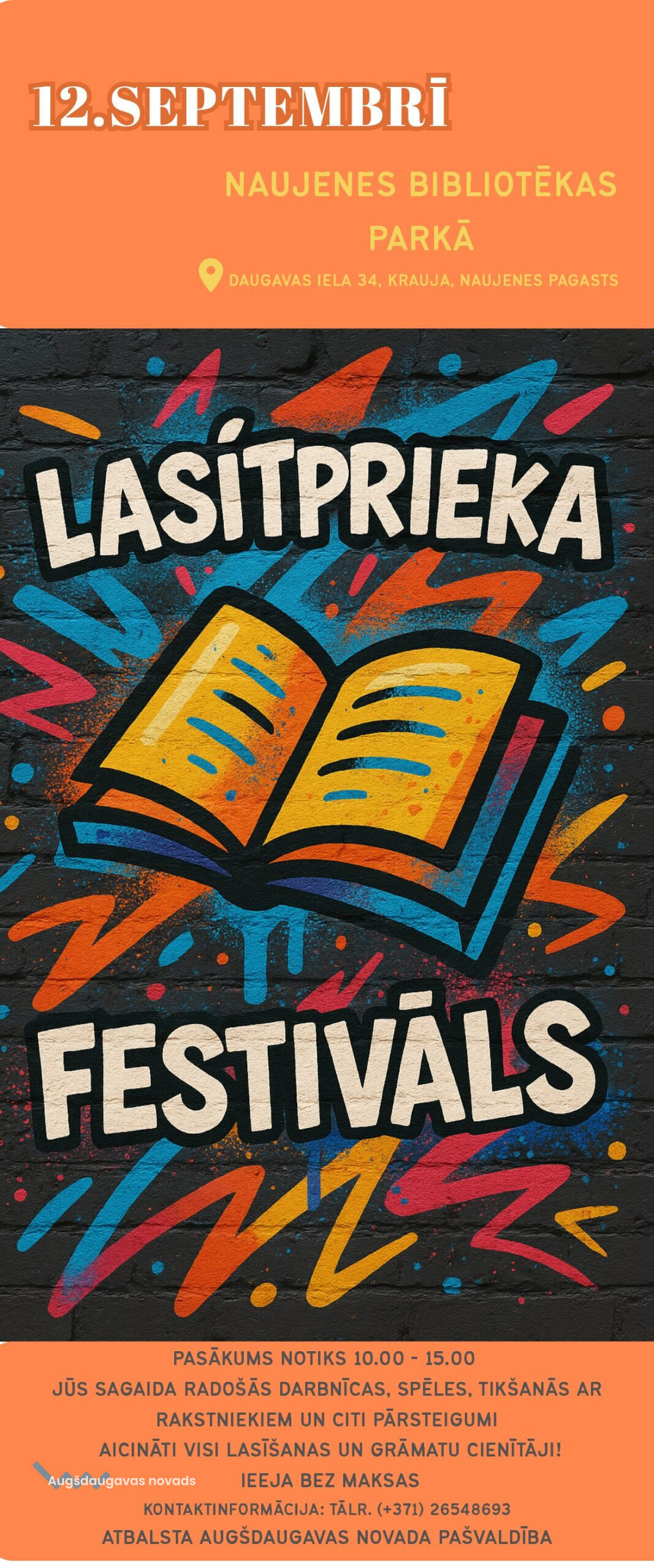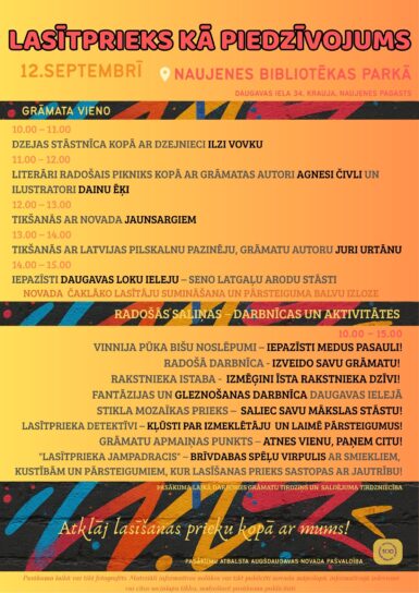 12.septembrī Naujenes bibliotēkas parkā (Daugavas ielā 34, Kraujā, Naujenes pagastā) ikviens aicināts atklāt grāmatu un lasīšanas prieku daudzveidīgās un aizraujošās aktivitātēs visas dienas garumā.